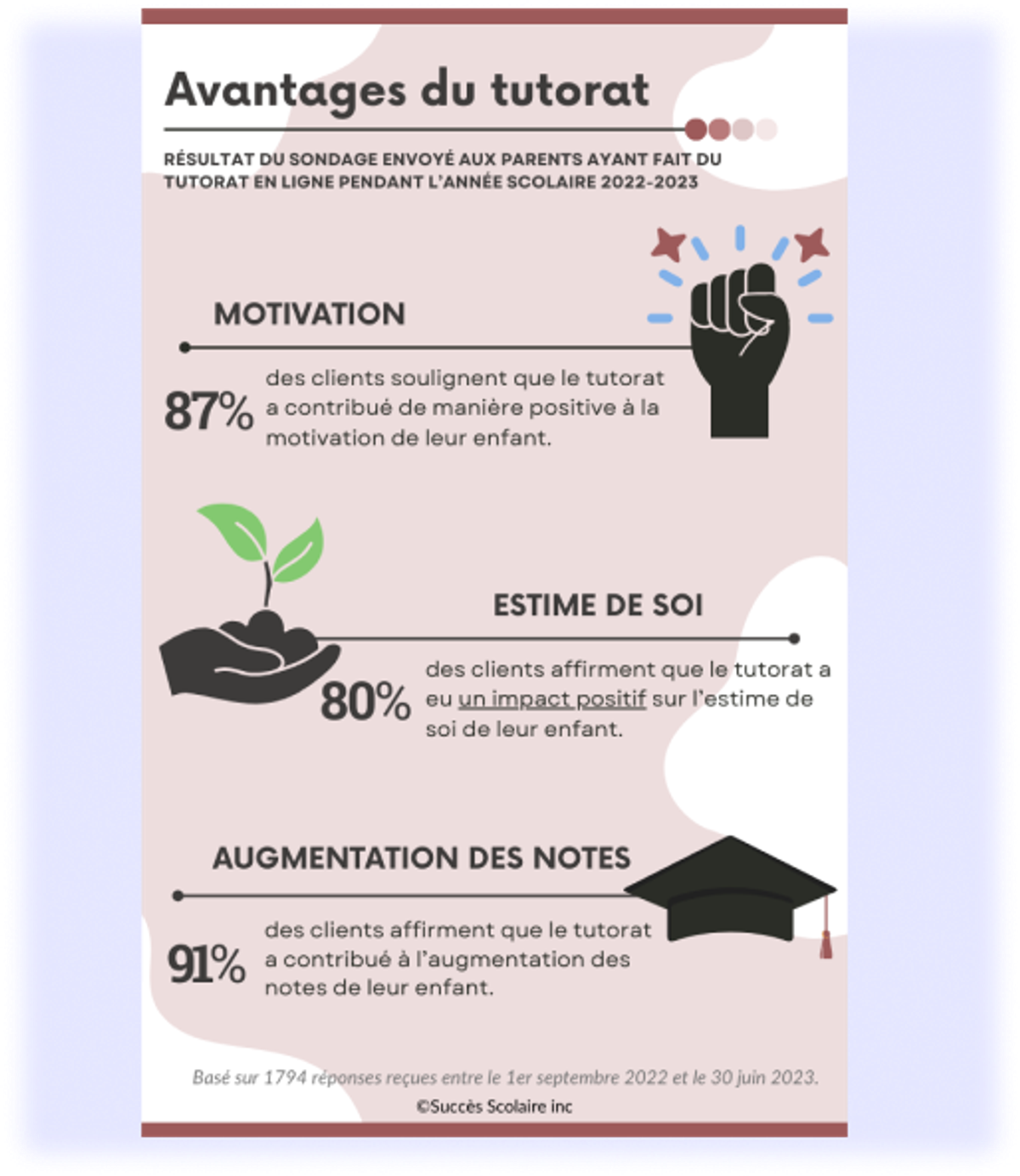 Le tutorat en ligne est un service qui a fait ses preuves. Le lien de confiance établi entre le tuteur ou la tutrice et votre enfant entraîne rapidement des effets positifs sur son estime de soi et sa motivation scolaire. Pour vous en convaincre, il suffit de jeter un coup d'œil sur les réponses des sondages envoyées aux parents.